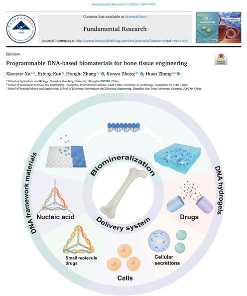 张欢课题组受邀在国家自然科学基金委员会主管、主办的综合性英文学术期刊Fundamental Research“未来生物材料”专题发表关于可编程生物材料的综述文章(Fundamental Research 2025, 5(4): 1384-1400),系统综述了以框架核酸为代表的可编程生物材料的在仿生矿化模板、骨组织递送系统等方面的研究进展,并详细探讨了其发展挑战和未来前景。骨缺损治疗仍面临多种局限,可编程DNA生物材料凭借独特的生物相容性和结构可控性,为骨再生材料开辟了新路径。